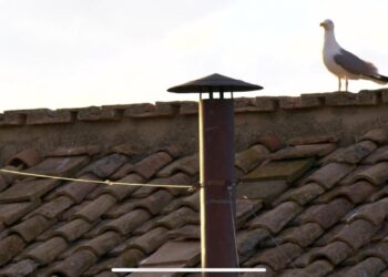 Nel giorno dell’apertura del conclave 2025, un gabbiano si posa sul comignolo della Cappella Sistina, evocando un’immagine identica a quella ...